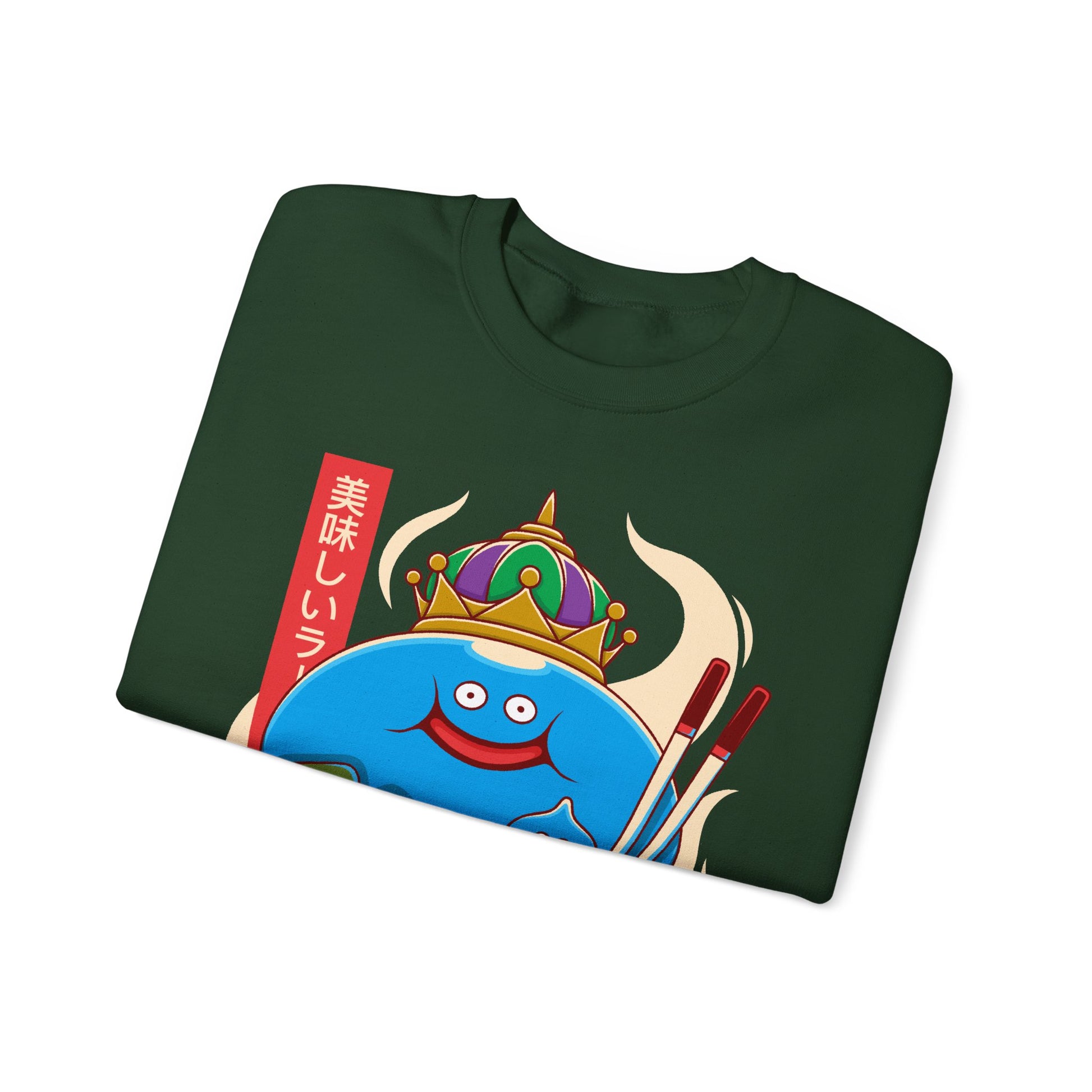 Gamer Crewneck Sweatshirt inspired by King Slime and Slime, Slimes from Dragon Quest pg- jrpg video games inside of a ramen noodles bowl in japanese art style.