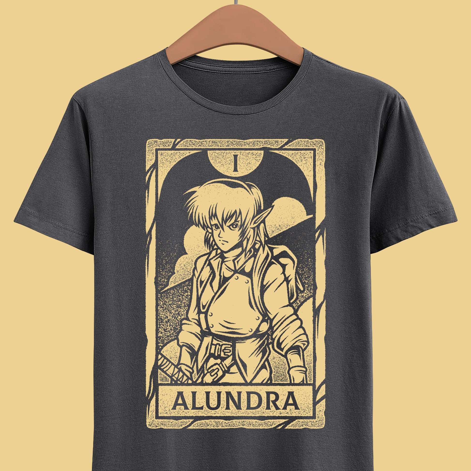 Gamer t-shirt inspired by Alundra the Dreamwalker from Alundra - The Adventures of Alundra action rpg video game in tarot card art style.