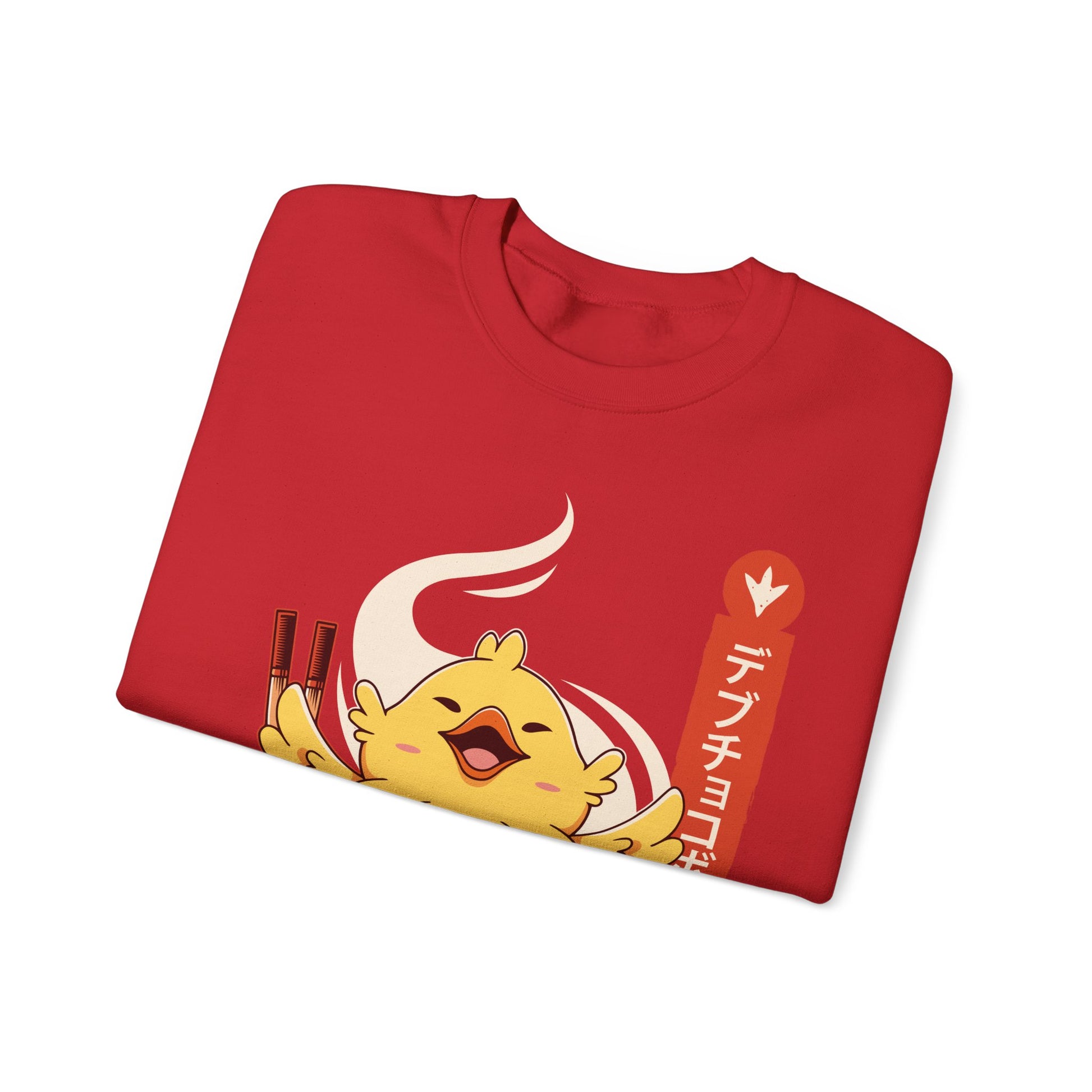 Gamer crewneck sweatshirt inspired by Fat Chocobo from Final Fantasy video games saga inside of a ramen bowl in japanese art style.
