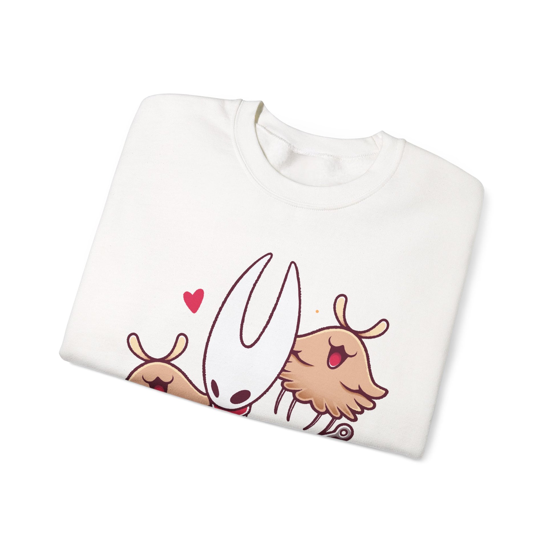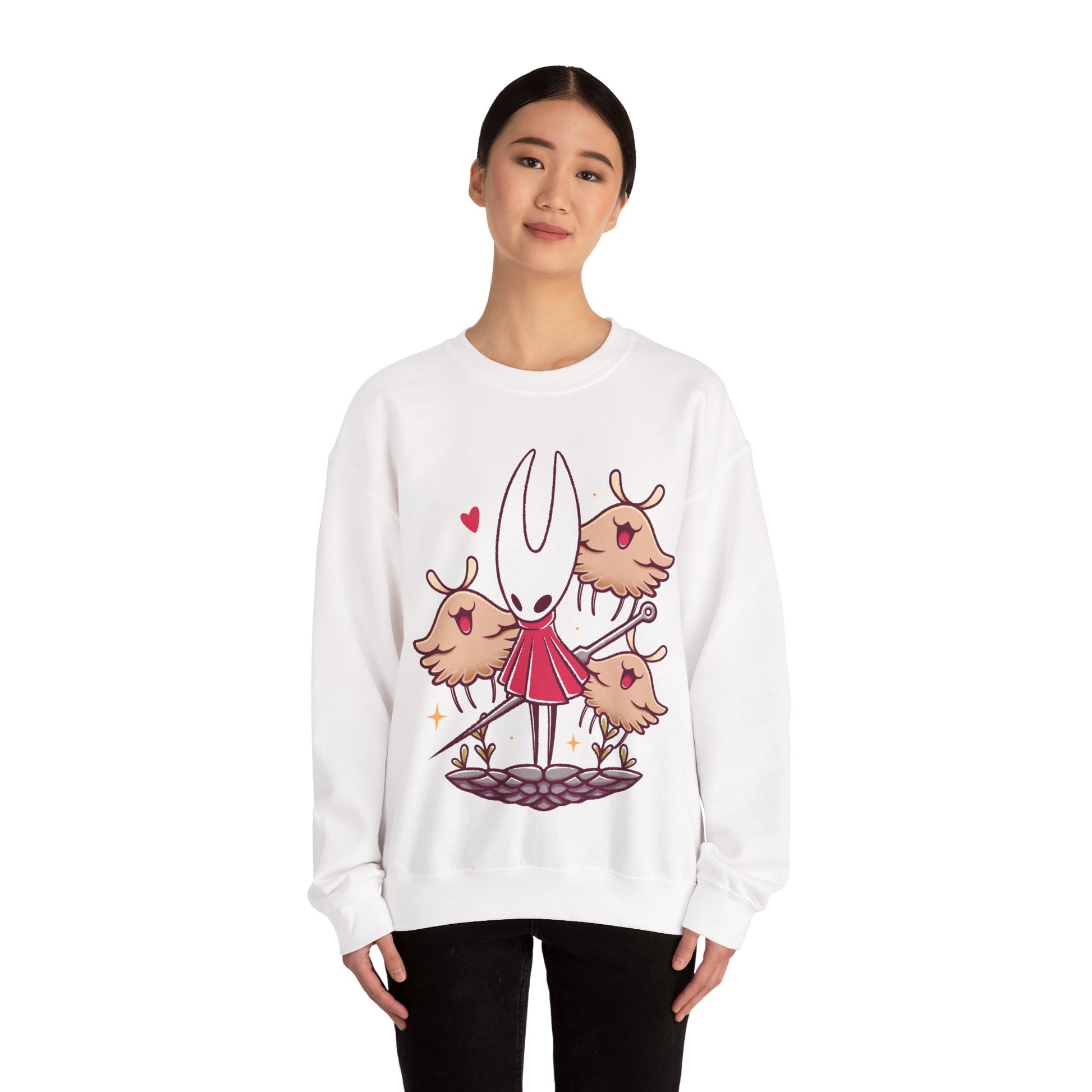 Gamer crewneck sweatshirt inspired by Hornet & Lost Fleas characters from Hollow Knight Silksong metroidvania indie game in cute kawaii art style.